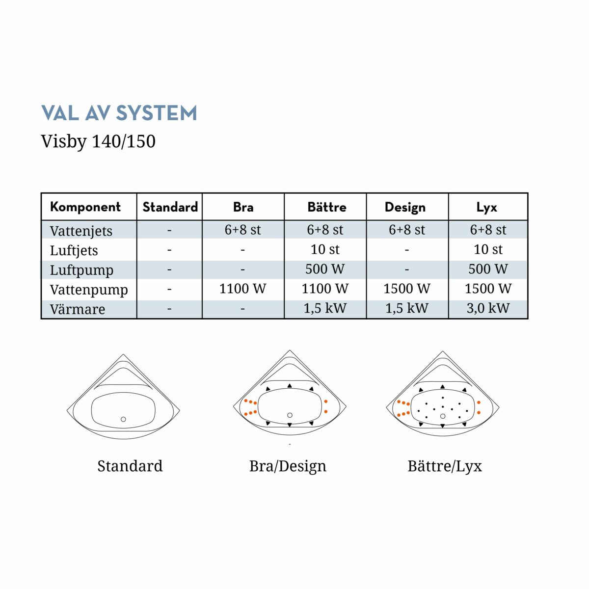 Visby kan väljas helt utan massage eller uppgraderas med något av våra fyra massageutföranden – från ett behagligt grundalternativ till en mer lyxig och kraftfull massageupplevelse. Badkaret levereras i vit sanitetsakryl med en hållbar och lättskött yta.